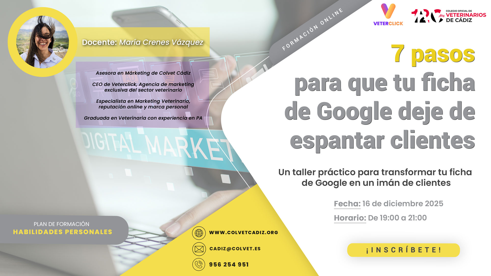El próximo día 16 de diciembre tendrá lugar, dentro de nuestra Línea de Formación de Habilidades Personales, la formación online "7 pasos para que tu ficha de Google deje de espantar clientes" impartida por María Crenes Vázquez, CEO de Veterclick, Agencia de marketing exclusiva del sector veterinario, Especialista en Marketing Veterinario, reputación online y marca personal y Graduada en Veterinaria con experiencia en PA.